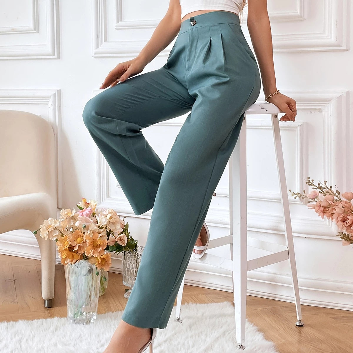 Feel empowered and confident every time you step into a room wearing the Women's Elegant High-Waisted Green Suit Trousers. Crafted for the modern woman, these trousers effortlessly blend sophistication with comfort, allowing you to shine at formal occasions. The rich green hue radiates elegance, ensuring you stand out while embodying grace.